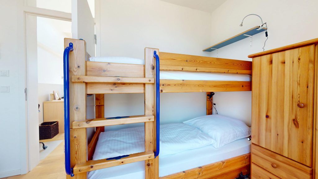 Über eine Treppe mit praktischem Sitzlift gelangen Sie ins lichtdurchflutete Obergeschoss. Das großzügige Wohnzimmer mit imposanter Fensterfront und Zugang zum Balkon lädt zum Verweilen ein. Hier befindet sich auch ein komfortables Schrankbett, das sich bei Bedarf ganz einfach ausklappen lässt. Ein weiteres Schlafzimmer bietet mit einem Hochbett und einem Zustellbett Schlafmöglichkeiten für drei Personen – ideal für Kinder oder Freunde.