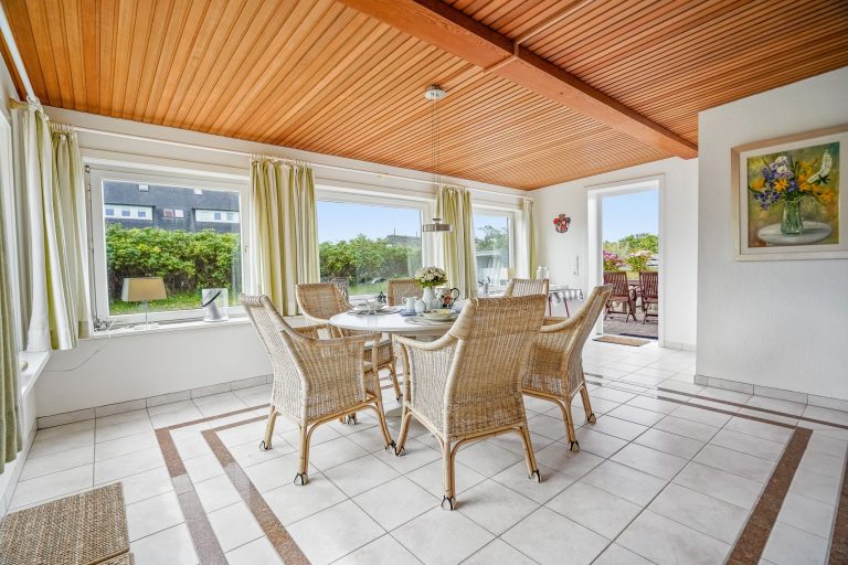 Im Erdgeschoss erwarten Sie ein Wohnzimmer mit Kamin, ein separates Esszimmer, eine gut ausgestattete Küche, zwei Schlafzimmer, ein Badezimmer mit Dusche sowie ein separates WC. Besonders schön ist der helle Wintergarten, von dem Sie direkt auf die Terrasse gelangen – ausgestattet mit zwei Strandkörben, perfekt zum Entspannen.