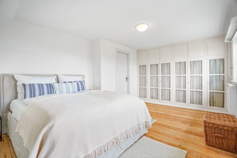 Im Obergeschoss befinden sich drei weitere Schlafzimmer: ein kleines Zimmer mit Einzelbett, ein größeres Zimmer mit Doppelstockbett und einem zusätzlichen Einzelbett sowie das Hauptschlafzimmer mit Doppelbett. Zudem gibt es hier ein weiteres Badezimmer mit Dusche.
