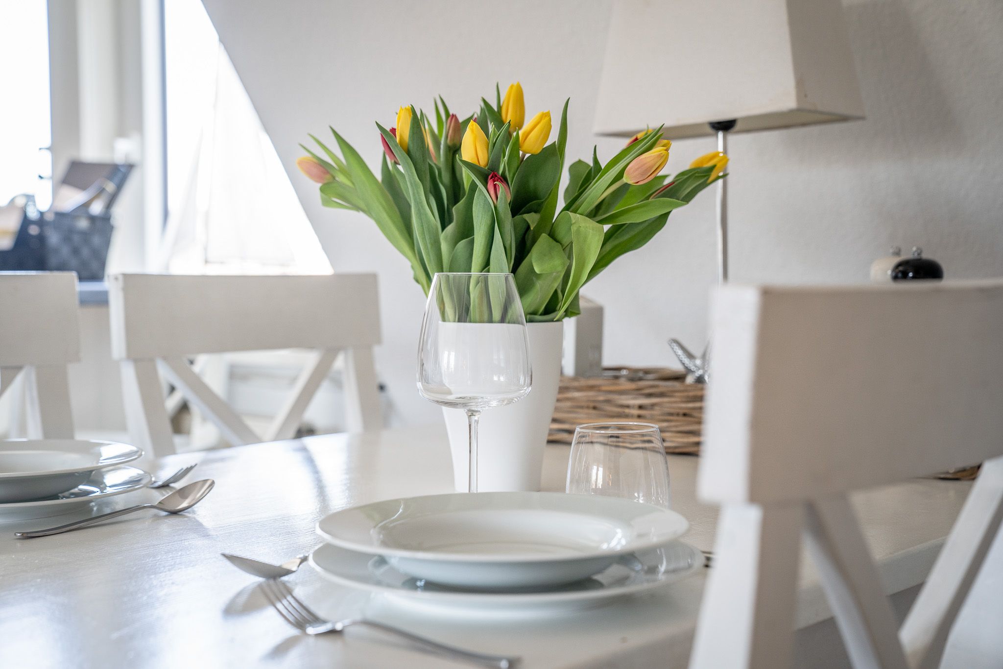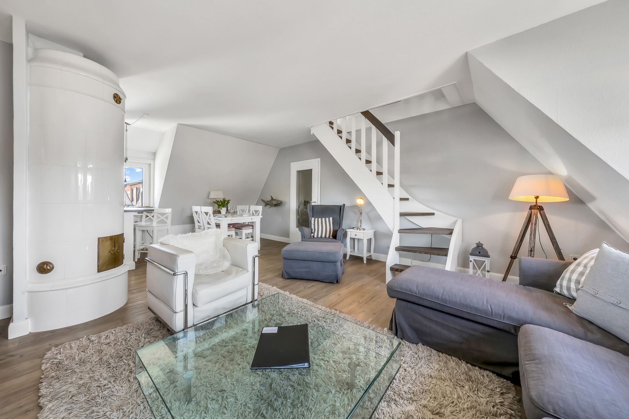 Die geschmackvolle Einrichtung der Wohnung, die vielen Lampen, die eine behagliche Atmosphäre erzeugen, der Ausblick auf die Dünen des Oststrandes.