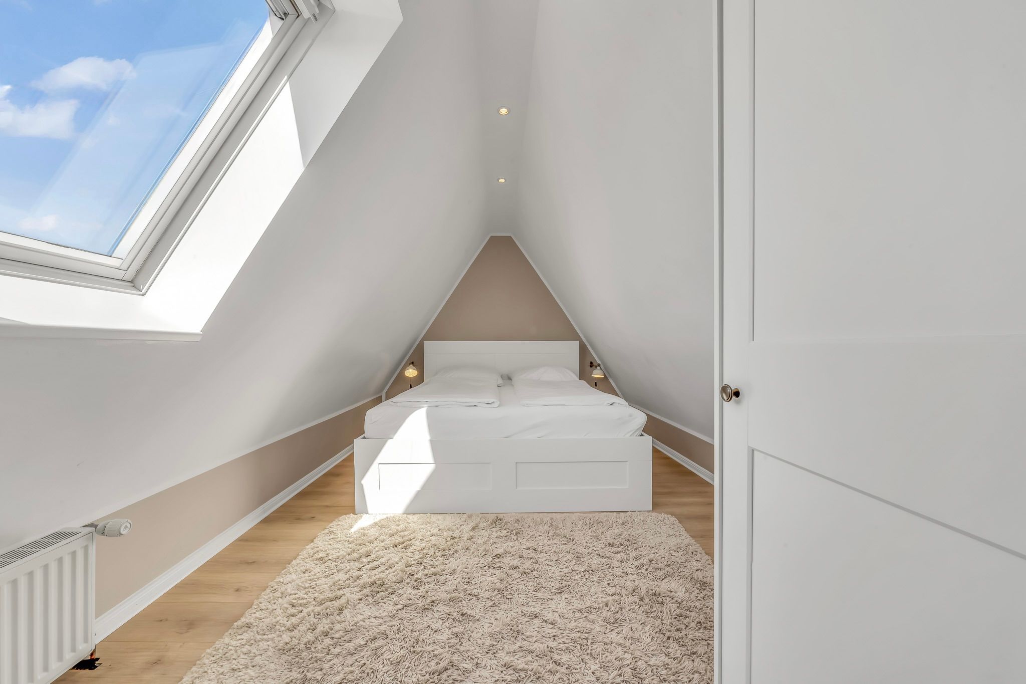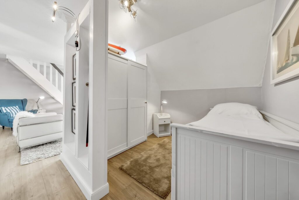 Im Obergeschoss erwartet Sie ein behagliches Schlafzimmer mit komfortablem Doppelbett und ausreichend Stauraum im Kleiderschrank.