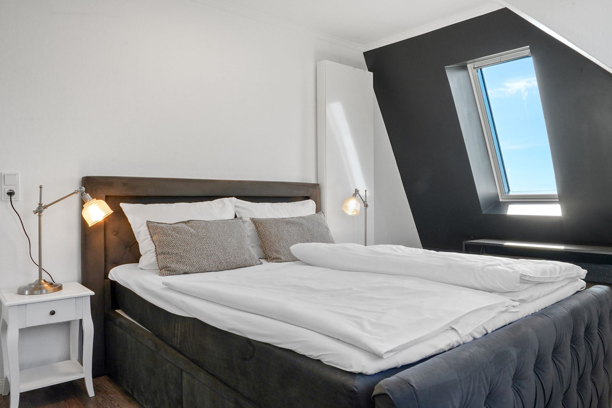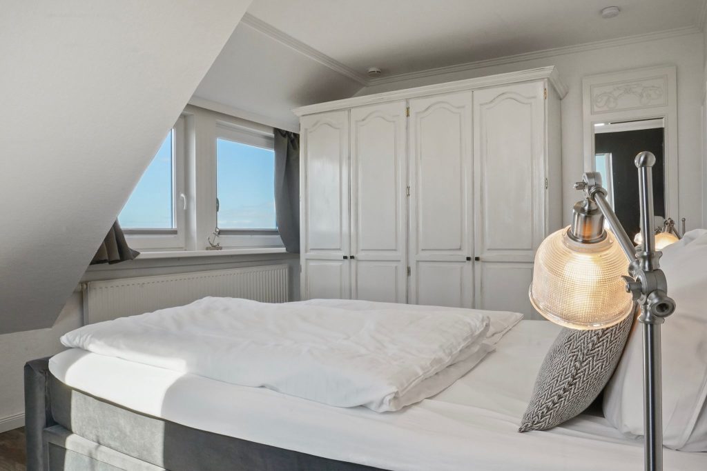 Das große Schlafzimmer der Suite ist modern mit einem hochwertigen Bxspringbett eingerichtet. Hier können Sie sich nach einem wundervollen Tag an der Küste herrlich zurückziehen und neue Energie für die kommenden Erlebnisse tanken. Ein Badezimmer mit einer Meerblick (!)-Dusche und allen nötigen Annehmlichkeiten sorgt für Ihr Wohlbefinden. Das Warmwasser und die Heizung werden mit regenerierbarer Energie (Geothermie) erwärmt und so schonen Sie in Ihrem Urlaub gleichzeitig die Umwelt. Für Ihr Auto gibt es direkt vor dem Haus einen kostenfreien Parkplatz und Ihre Fahrräder können Sie in der geschützten Garage unterstellen. Außerdem verfügt die Kreuzfahrer-Suite über einen großen Süd- und einen großen Westbalkon, beide mit Meerblick zur freien Nordsee.