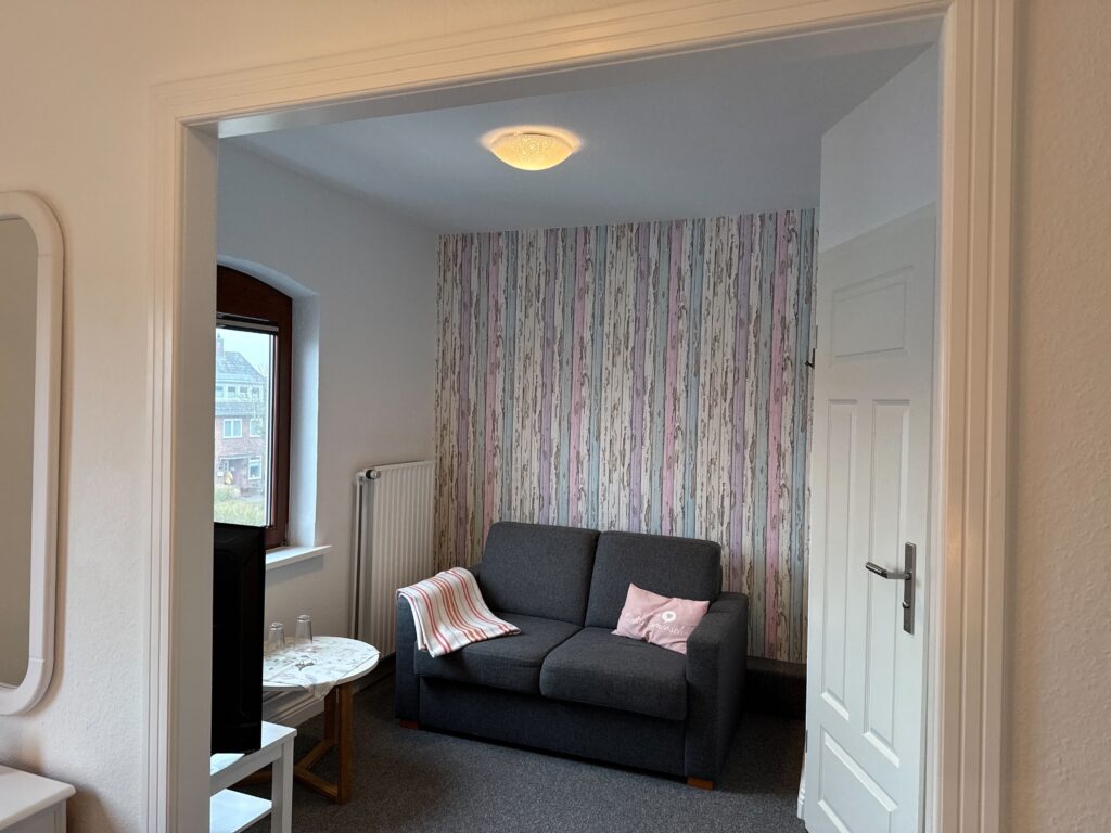 Das Zimmer verfügt über ein komfortables Doppelbett, separates Wohnzimmer mit Sofa, TV und WLAN. Ein eigenes Duschbad mit WC sorgt für Privatsphäre und Bequemlichkeit.