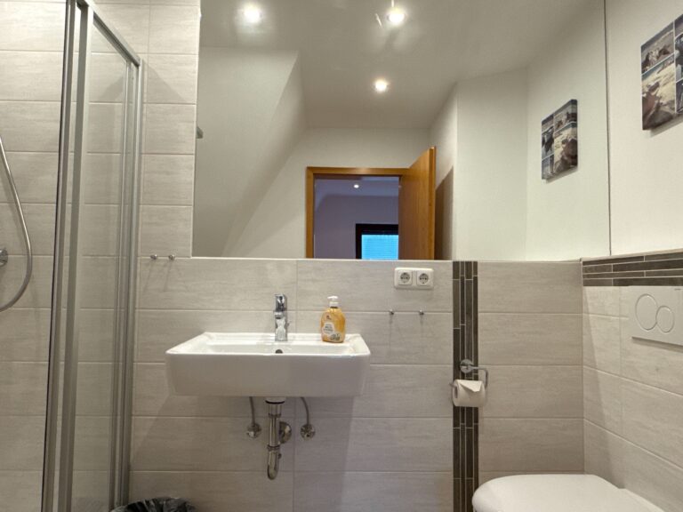 Das Zimmer verfügt über ein Doppelbett, TV und WLAN sowie ein eigenes Duschbad mit WC.