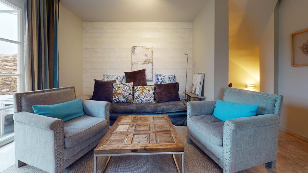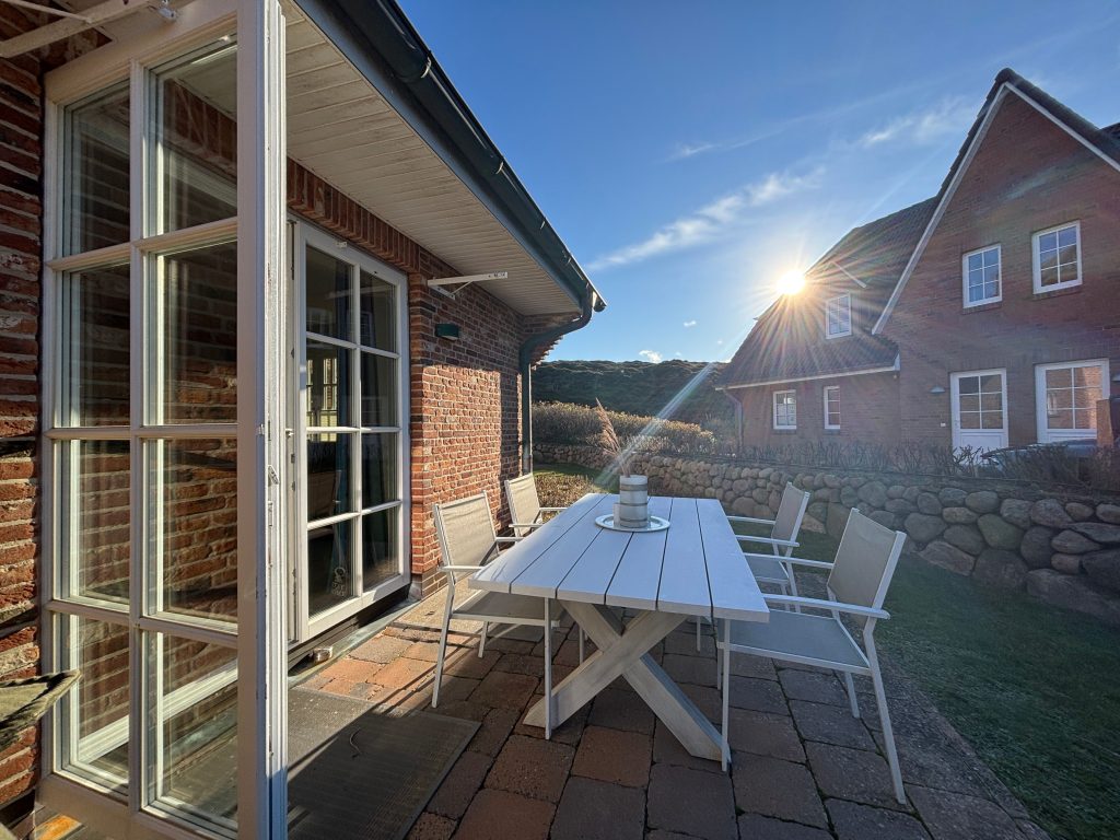 Vom Wohnbereich gelangen Sie direkt auf die Terrasse mit Gartenmöbeln und im Sommer eigenem Strandkorb (April – Oktober), perfekt, um in der Sonne zu entspannen oder den Tag bei einem Glas Wein ausklingen zu lassen.