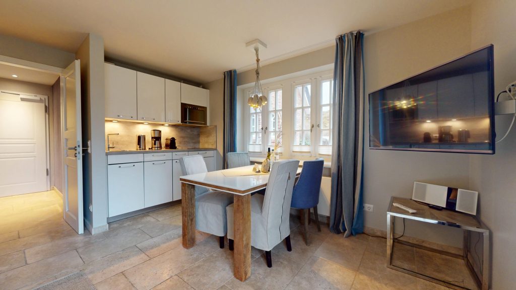 Im Erdgeschoss erwartet Sie ein einladender Wohnbereich mit Essplatz, der durch seine helle, freundliche Gestaltung sofort Urlaubsatmosphäre aufkommen lässt. Die integrierte Küchenzeile ist mit Mikrowelle, Geschirrspüler, Kaffeemaschine und Nespresso-Maschine ausgestattet. Ideal für unkomplizierte Mahlzeiten zwischendurch.