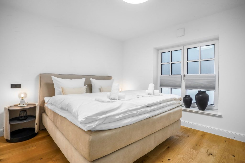 Schlafzimmer mit hochwertigem Doppelbett (180x200cm), Badezimmer mit Dusche und freistehender Badewanne