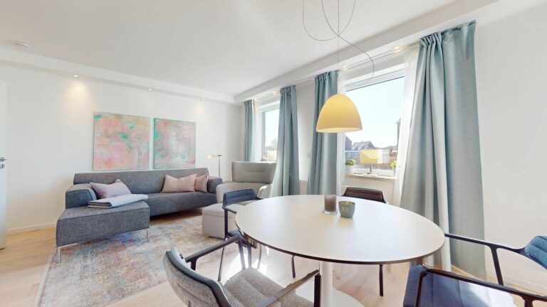 Die Wohnung bietet Platz für bis zu vier Personen und befindet sich im Hochparterre. Die durchdachte Raumaufteilung sorgt für eine angenehme Wohnatmosphäre: Ein helles Wohnzimmer mit Essbereich geht in eine offene, moderne Küche über, die mit einem hochwertigen BORA-Kochfeld ausgestattet ist – perfekt für gemeinsame Kochmomente. Ein separates Schlafzimmer lädt zum Entspannen ein, während ein zusätzliches Zimmer mit einer bequemen Schlafcouch flexibel nutzbar ist. Das große Tageslichtbad mit Regendusche sorgt für Wellness-Feeling, und ein zusätzliches Gäste-WC ist auch vorhanden.
