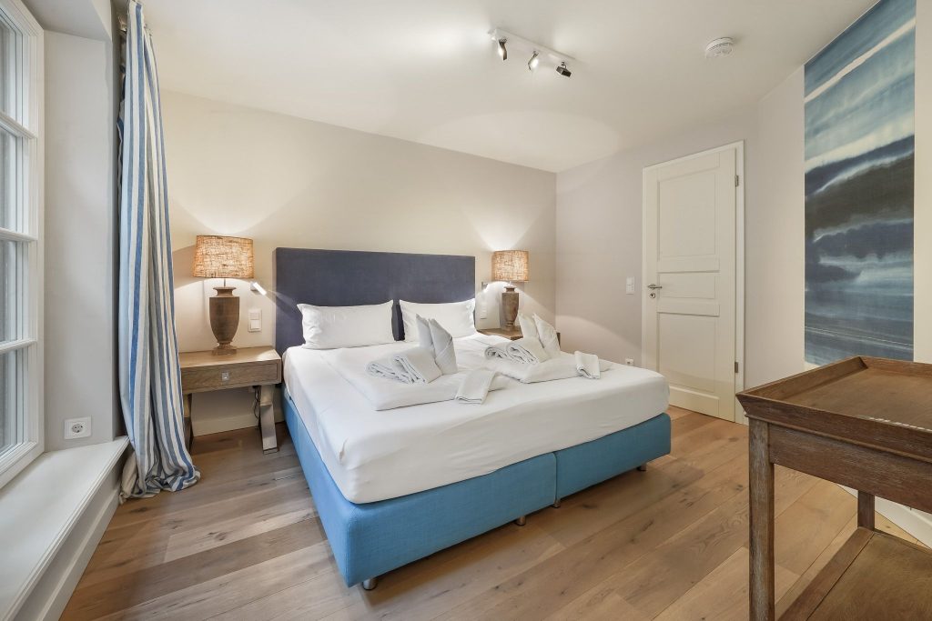 Das Hauptschlafzimmer ist mit einem Doppel-Boxspringbett, TV sowie