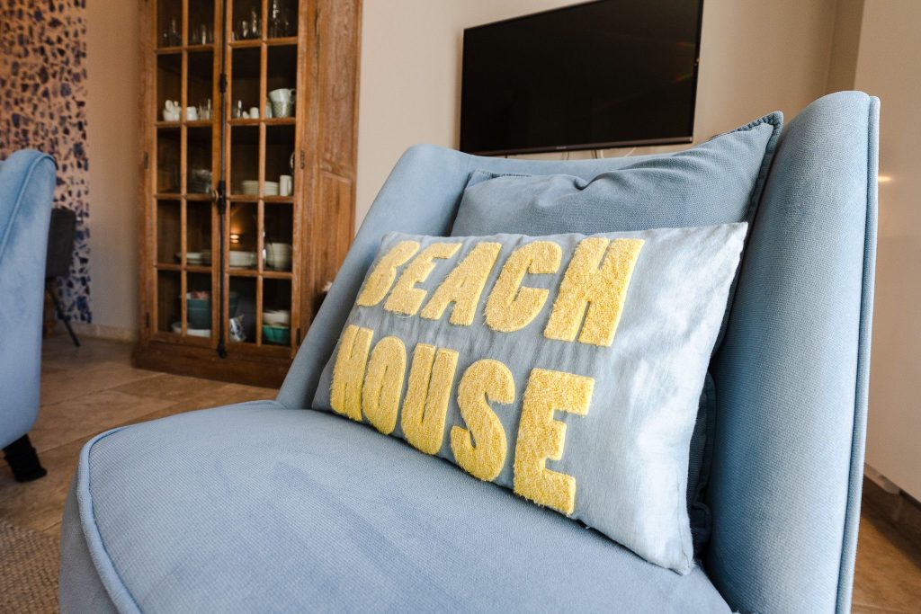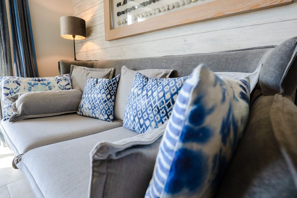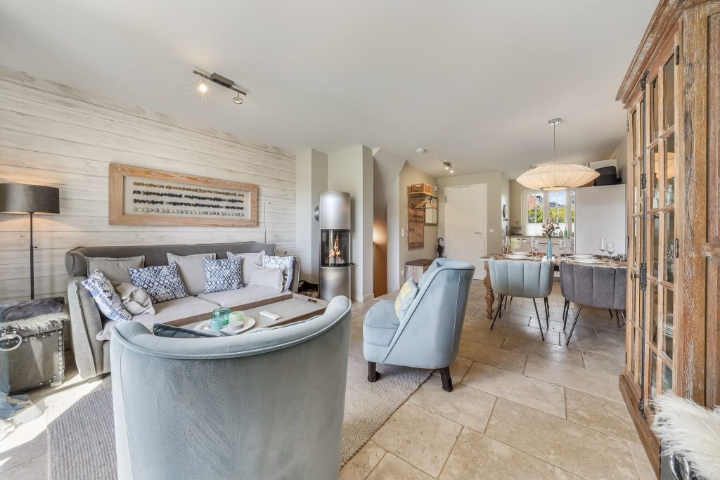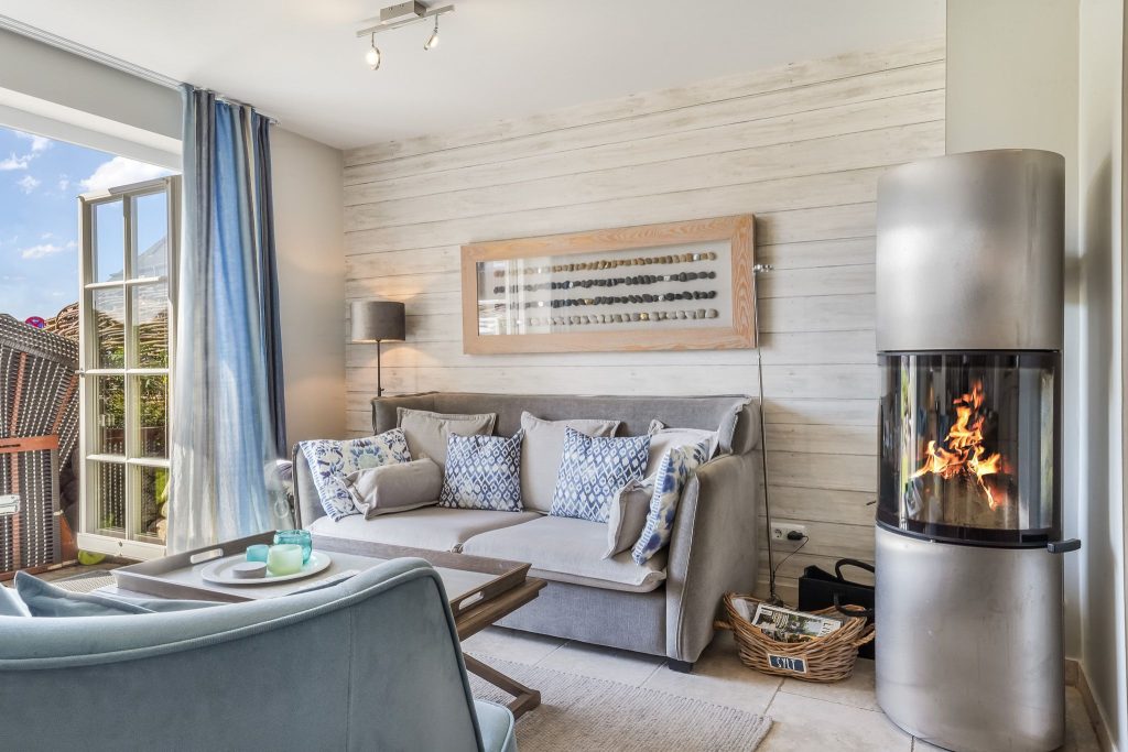 gestaltete Wohnbereich lädt mit seiner gemütlichen Sofaecke, einem Kamin sowie