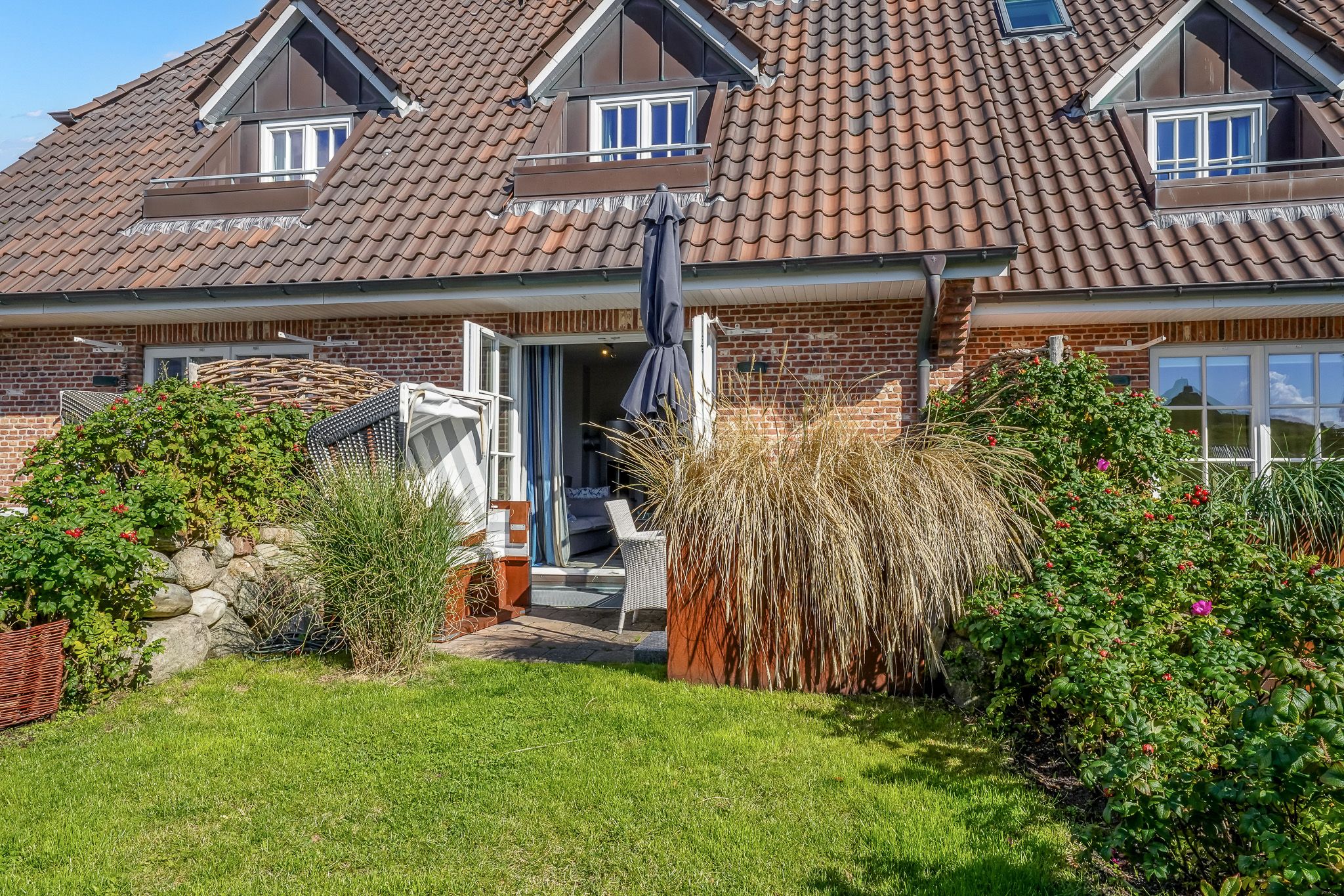 Strandkorb und angrenzendem Gartenstück. Über eine gut begehbare Treppe