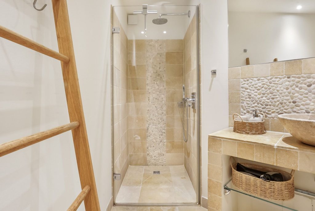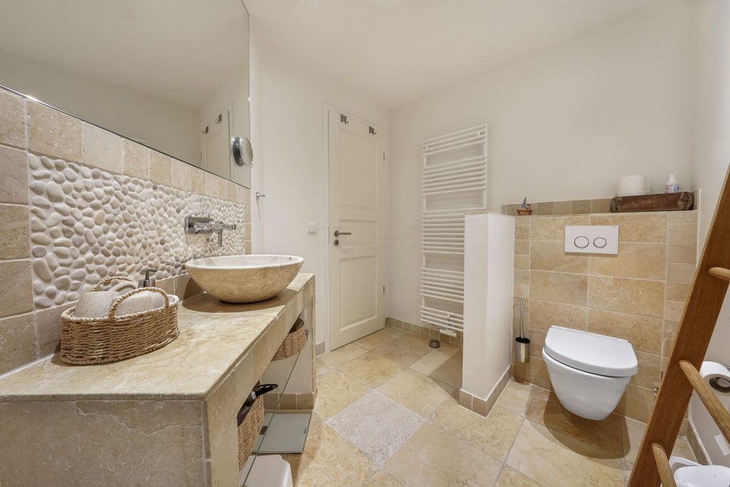Kellerschacht. Ein großzügiges, helles, mediterranes Badezimmer bietet alles