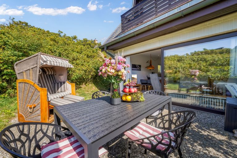 Im modernen, eleganten Stil bietet unsere Ferienwohnung Ihnen jeglichen Komfort. Die ruhig gelegene Terrasse ist Richtung Süd-West ausgerichtet, so dass Sie die Sonne von morgens bis abends geniessen können. Sie ist mit einem Strandkorb und Gartenmöbeln ausgestattet und liegt windgeschützt inmitten von Sylter Rosen. Sollte es stürmen oder regnen, gehen Sie eine Treppe tiefer direkt im Haus im Bademantel in das Schwimmbad oder schwitzen in der Sauna. Die Wohnung verfügt über einen Eingangsbereich mit Garderobe, 2 Schlafzimmer mit je 2 Doppelbetten und ein modernes Duschbad. Das Kernstück der Wohnung ist der gemütliche, großzügige Wohnbereich mit offener, hochwertiger Küche, die keine Wünsche offen lässt. Aufgrund der Kücheninsel, wird Ihnen genügend Platz für ausgiebige Kochabende mit Familie & Freunden geboten.