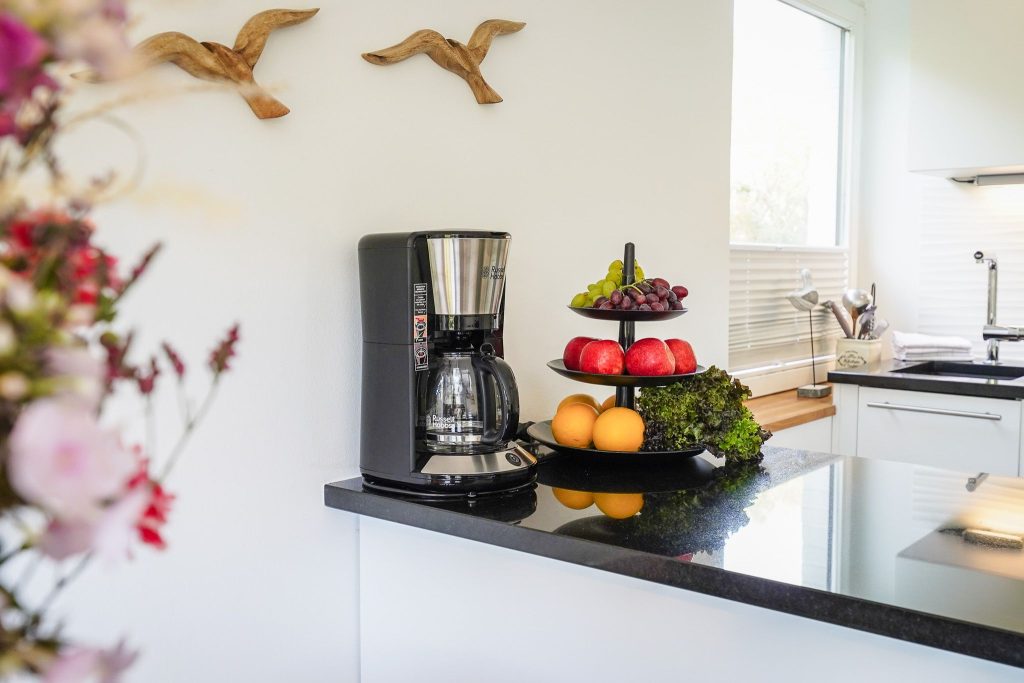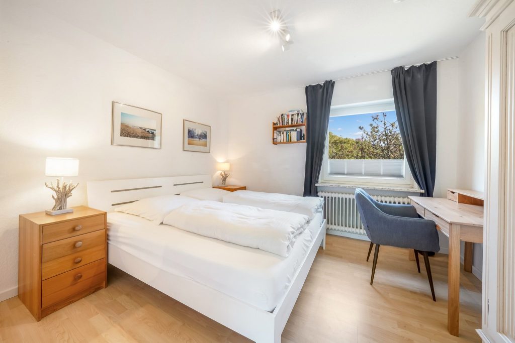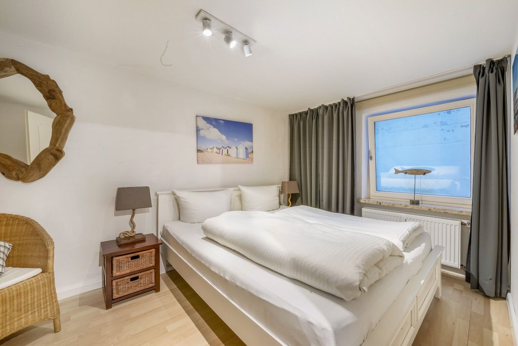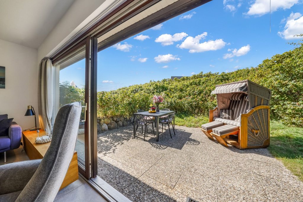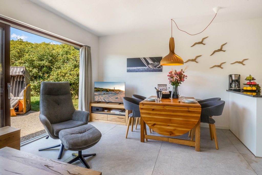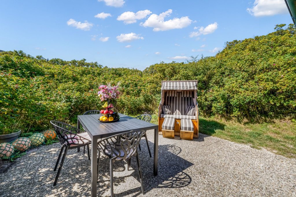 Im modernen, eleganten Stil bietet unsere Ferienwohnung Ihnen jeglichen Komfort. Die ruhig gelegene Terrasse ist Richtung Süd-West ausgerichtet, so dass Sie die Sonne von morgens bis abends geniessen können. Sie ist mit einem Strandkorb und Gartenmöbeln ausgestattet und liegt windgeschützt inmitten von Sylter Rosen. Sollte es stürmen oder regnen, gehen Sie eine Treppe tiefer direkt im Haus im Bademantel in das Schwimmbad oder schwitzen in der Sauna. Die Wohnung verfügt über einen Eingangsbereich mit Garderobe, 2 Schlafzimmer mit je 2 Doppelbetten und ein modernes Duschbad. Das Kernstück der Wohnung ist der gemütliche, großzügige Wohnbereich mit offener, hochwertiger Küche, die keine Wünsche offen lässt. Aufgrund der Kücheninsel, wird Ihnen genügend Platz für ausgiebige Kochabende mit Familie & Freunden geboten.