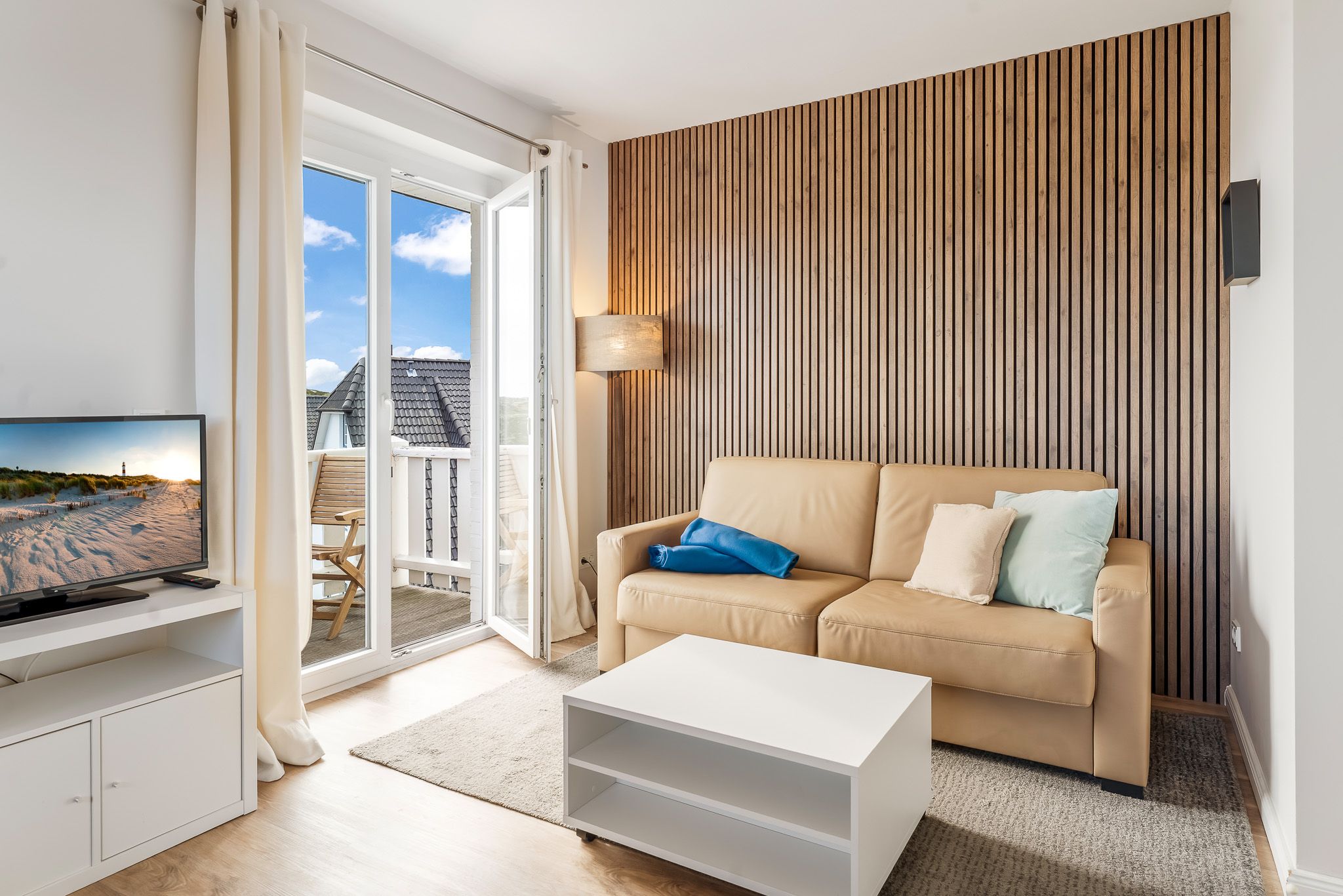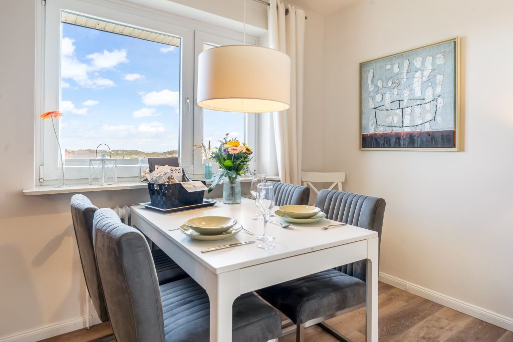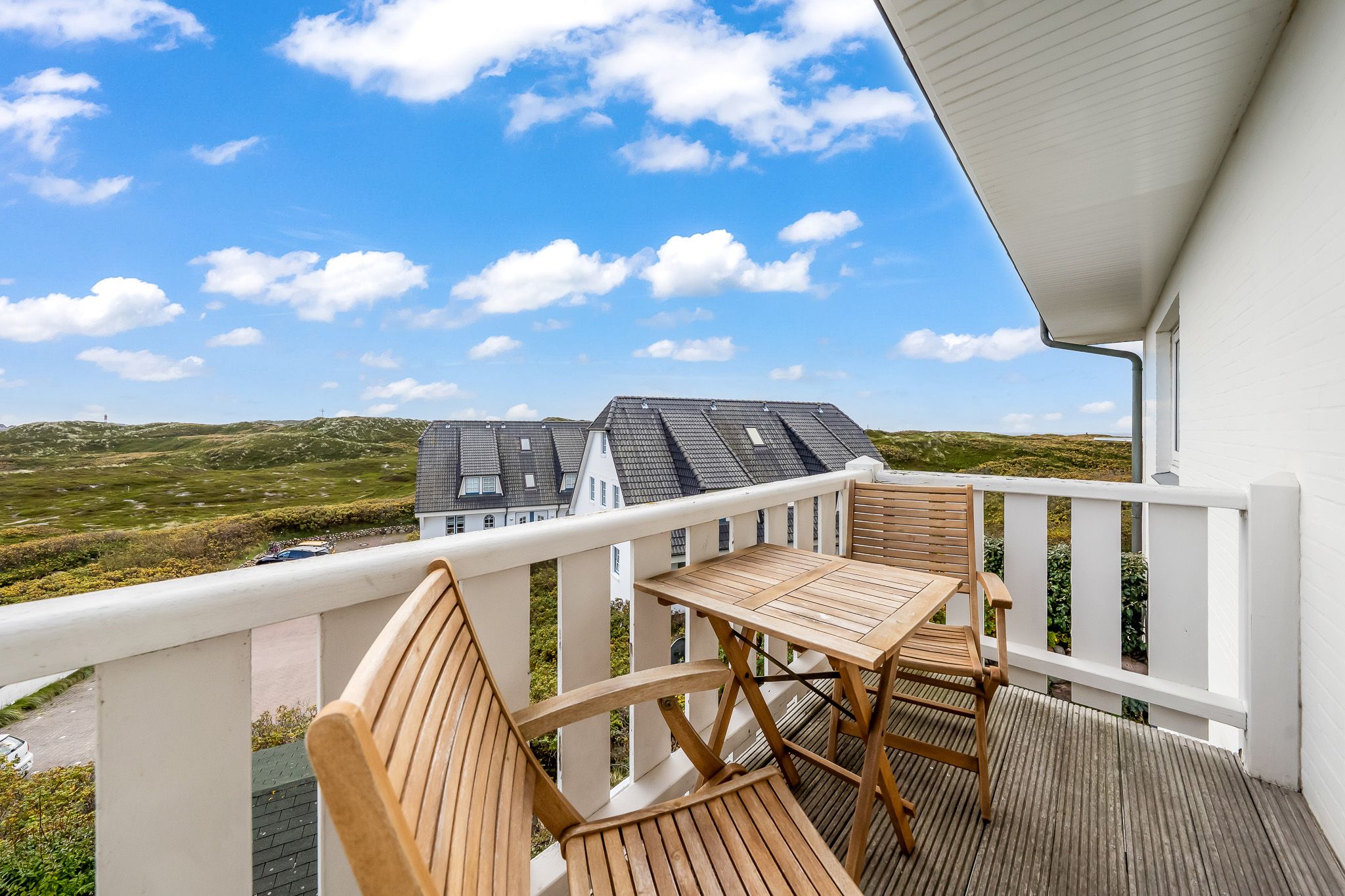 Der helle, modern gestaltete Wohnbereich ist mit einem gemütlichen Sofa ausgestattet, das auch als Schlafcouch genutzt werden kann. Eine Esse...Weiterlesencke und eine gut ausgestattete Küchenzeile sind ebenfalls vorhanden. Auf dem Südbalkon mit Sitzgelegenheiten können Sie Ihren morgendlichen Kaffee im Sonnenschein genießen. Vom Sofa aus haben Sie einen traumhaften Blick über den Golfplatz bis hin zum Hörnumer Hafen und bei guter Sicht sogar bis zu den Inseln Föhr und Amrum.