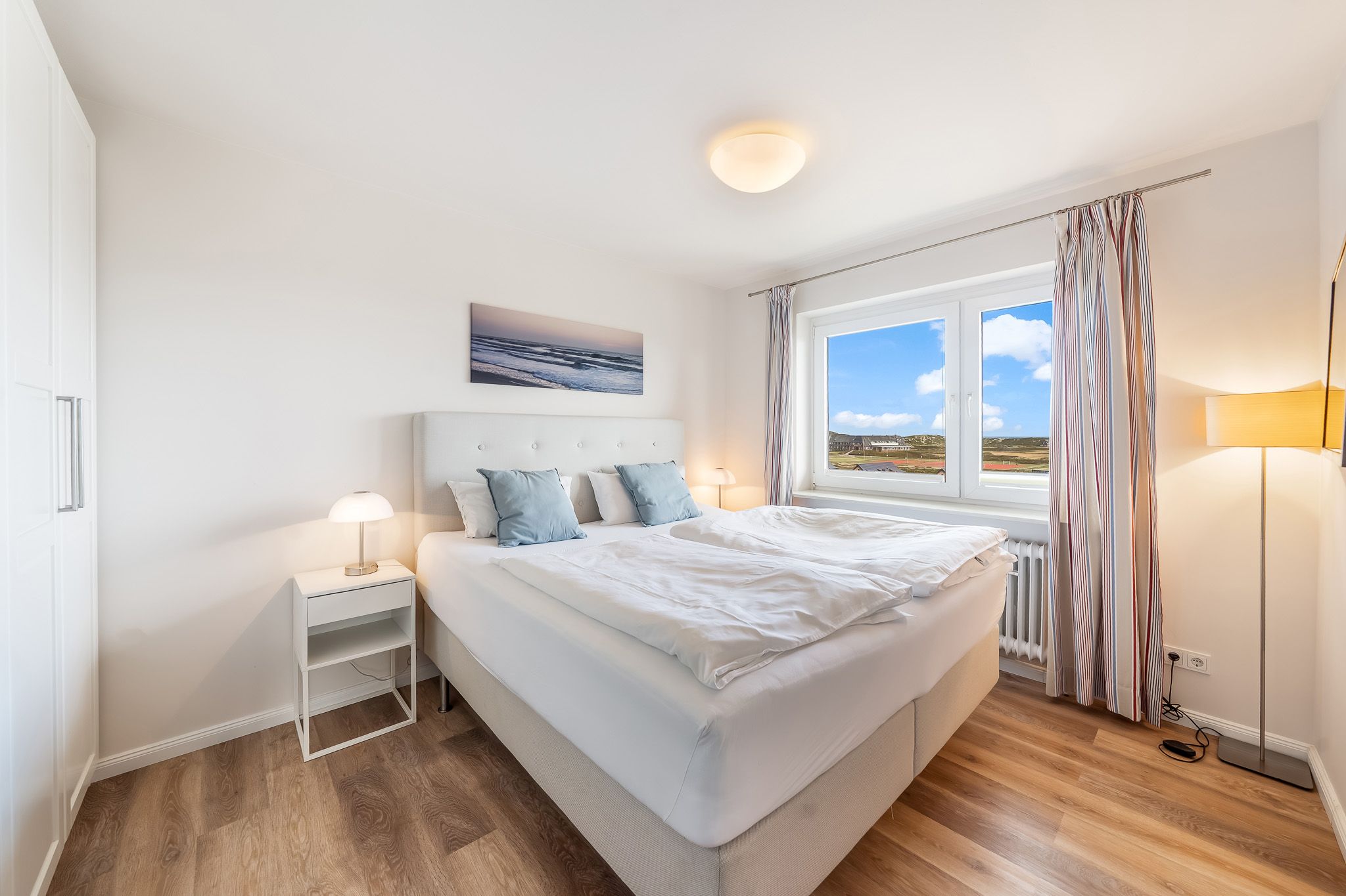 Das gemütliche Schlafzimmer bietet einen schönen Ausblick auf die Ostseite Hörnums. Es ist mit einem Boxspringbett und einem Schrank eingerichtet.