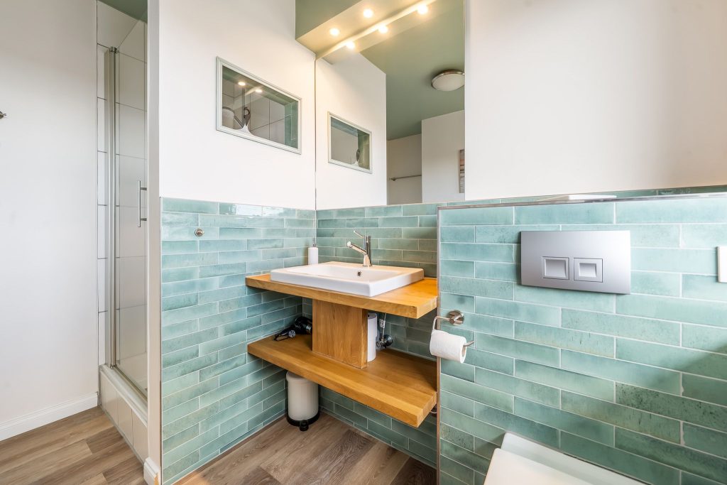 Das helle Tageslichtbad ist mit einer großzügigen Regendusche ausgestattet.